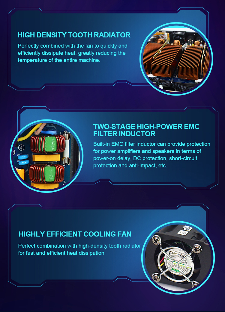 1. Use Class D power amplifier module. Unique peak clipping limiter and ripple reduction.
